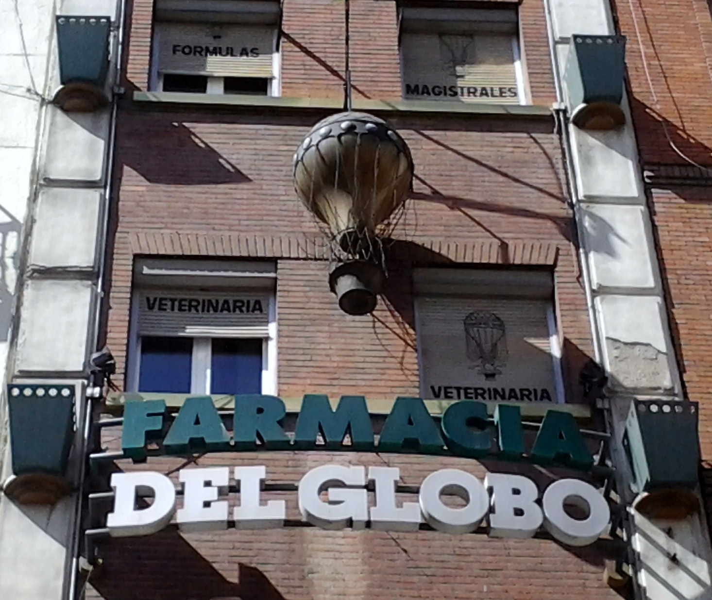 El globofarol fue sustituido por un Montgolfier (denominado así por los dieciochescos hermanos franceses pioneros de la aerostática de ese apellido) y los carteles a toda mayúscula por persianas pintadas. Ahora el edificio pertenece a la farmacia de abajo arriba.